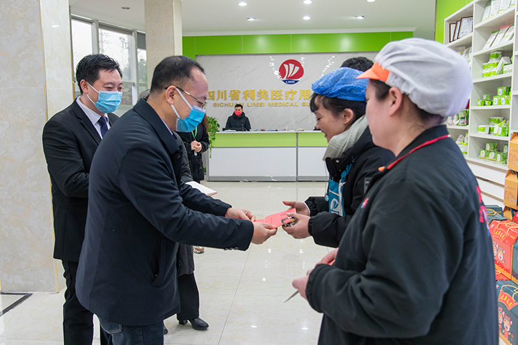 1月26日,射洪市經(jīng)開區(qū)陳學主任到四川利美醫(yī)療用品有限公司慰問一線員工,并為他們送去慰問品和慰問金。
