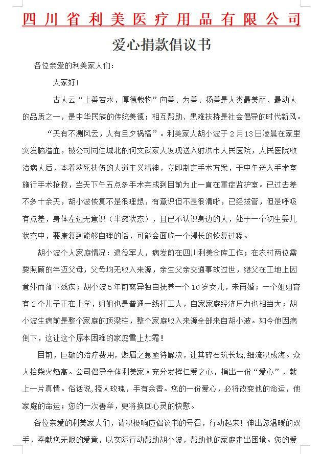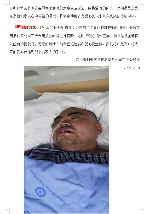 2月22日8:00利美集團(tuán)為胡小波發(fā)出“愛(ài)心捐款活動(dòng)”,全體家人紛紛響應(yīng),將愛(ài)心與善心傳遞,本次愛(ài)心捐共募捐善款現(xiàn)金12255元,微信6508元共18763元人民幣。在此,我們向積極參加此次愛(ài)心捐的全體利美家人和朋友們表示感謝,感謝大家無(wú)私的愛(ài)。