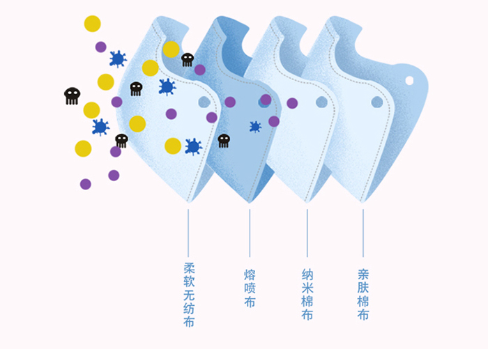 口罩采用的是四層防護,最外層采用的是白色百織造布,第二層為熱風(fēng)棉,第三層為高效過濾熔噴布,內(nèi)層為白色的無紡布親膚無敏。