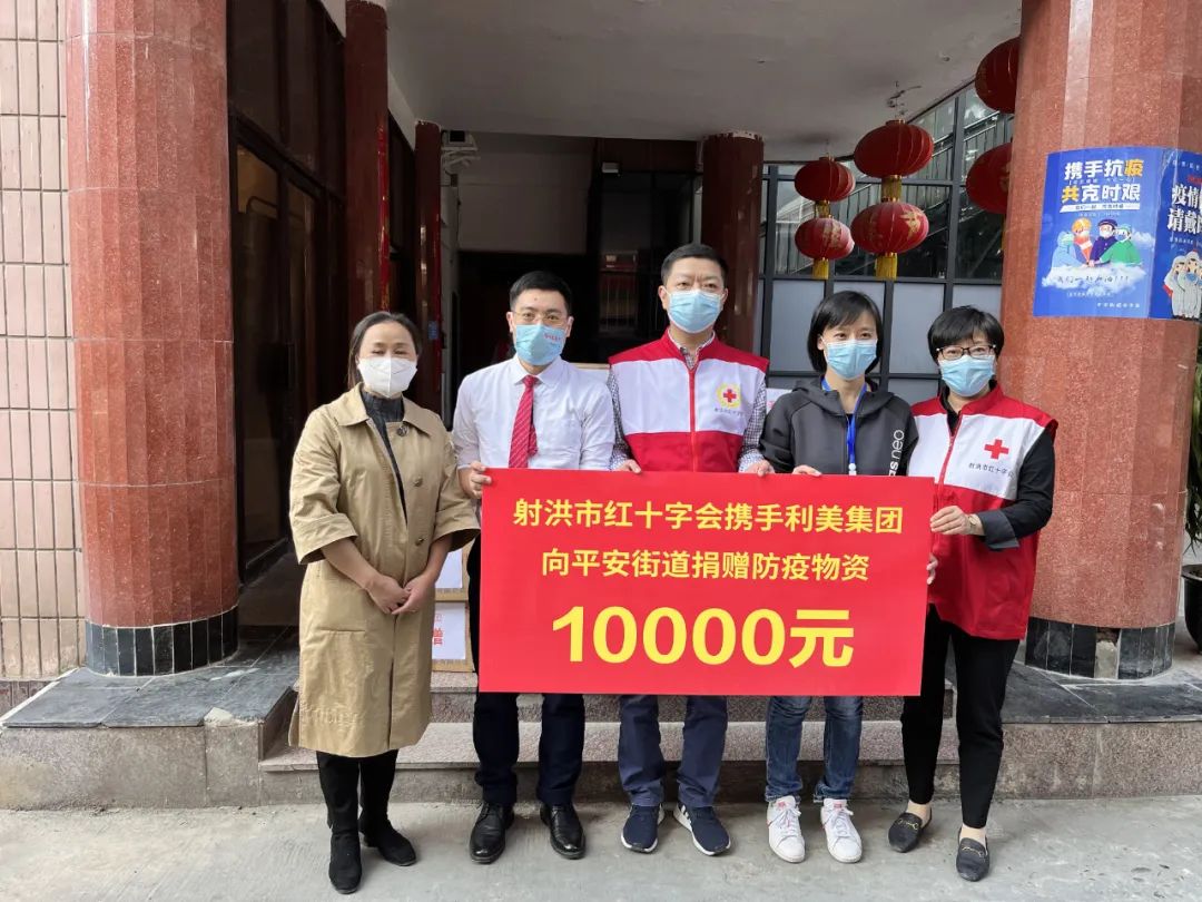 圖為利美集團業(yè)務部經(jīng)理張雄同紅十字會常務副會長李強向射洪市平安街道捐贈價值一萬元防疫物資。